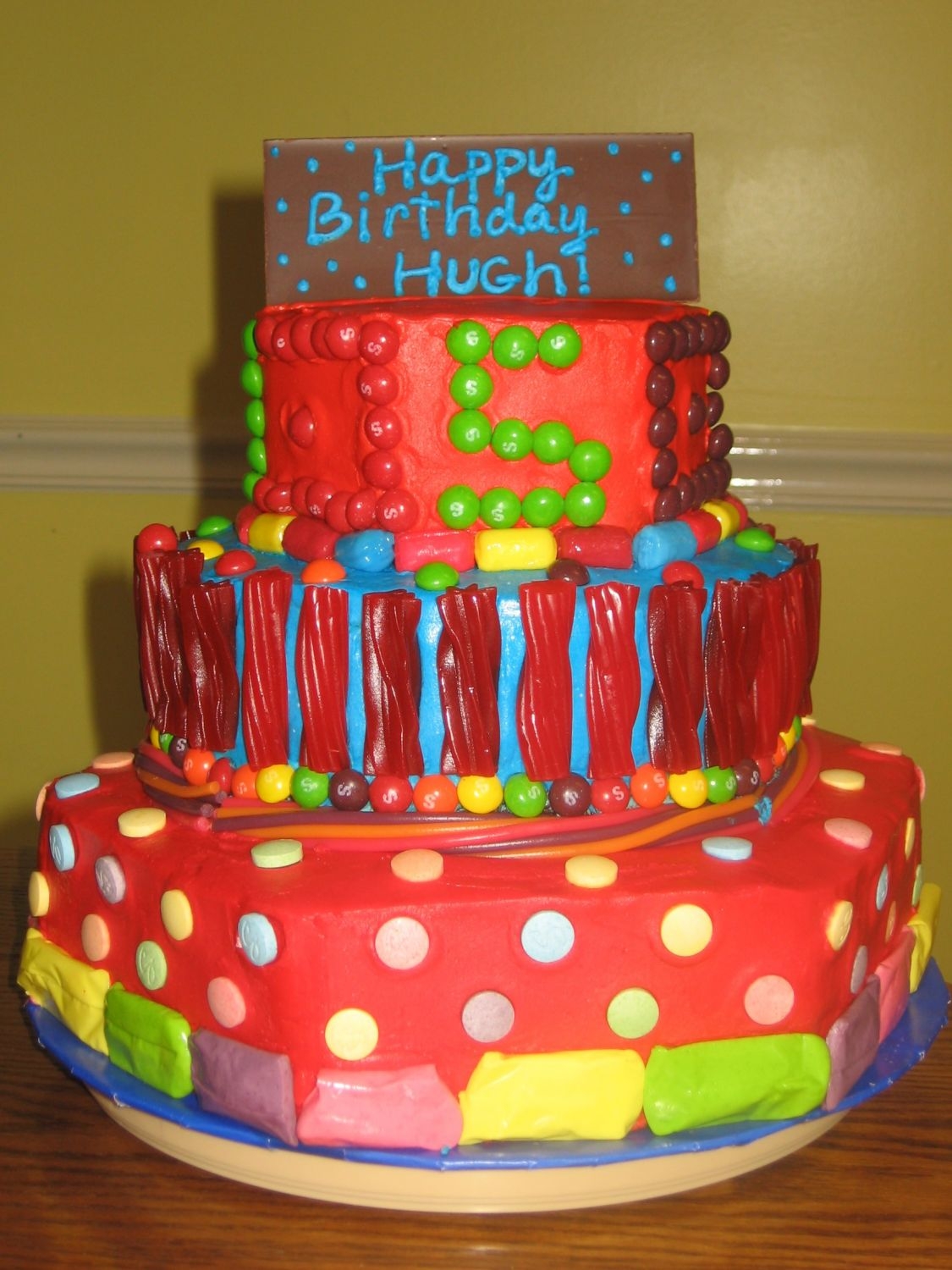 I made this for a little boy's 5th birthday. He wanted a "candy cake". If nobody at this party develops a cavity, it will be a miracle! Bottom layer is a 12 inch hexagon, yellow cake with chocolate buttercream filling and chocolate icing, middle is 8" round chocolate cake with cookies & cream filling and buttercream icing, and top is a 6" hexagon yellow cake with chocolate buttercream filling and buttercream icing. All of the decorations are candy - Twizzlers, Sweet Tarts, Laffy Taffy, Skittles, etc.