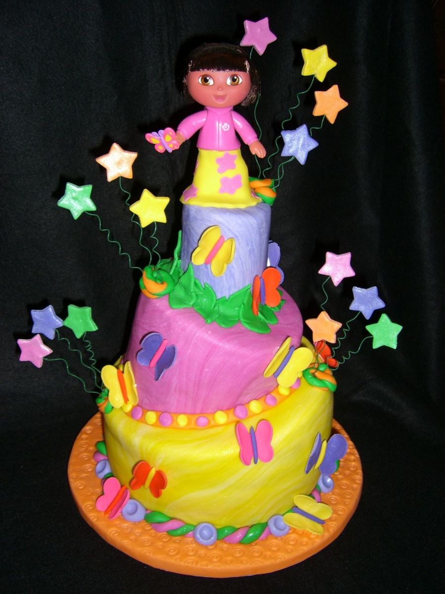 This is the third or fourth topsy turvy Dora cake I have done in the last few months - all for 3 year old girls. I keep trying to do them a little bit different so they all don't look identical. I really enjoyed this one. All mmf. Choc and yellow cakes. The birthday girly squealed when I dropped it off, so I guess that was a good sign. Thanks for looking!