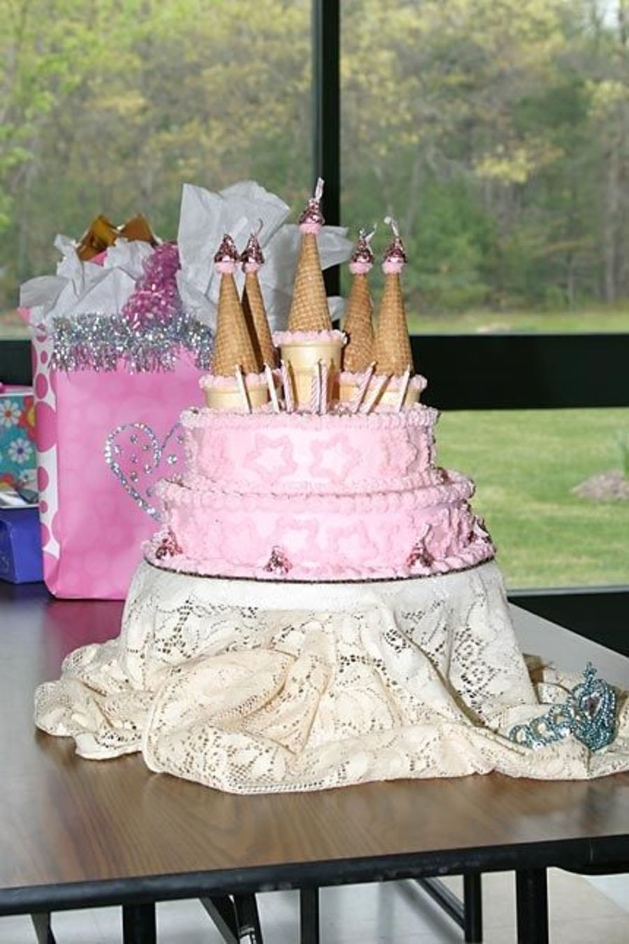 The cakes are single layers, but the bottom of the cone is actually cut off. the only cone that is pushed into the cake, even a little, is the tallest pillar in the back! If I did this cake again, I would have made the cakes a little bigger with layers. This cake looks so flat to me now.