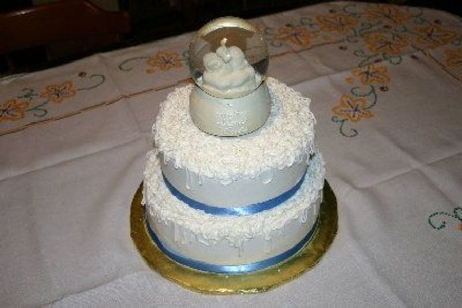 This was a two tiered cake for my grandson's baptism. Top layer is white and bottom layer is chocolate. It is all buttercream icing. I wanted something very simple. I used a Snow Babies snow globe for the top - It says a Gift From God. I also wanted the icing to resemble snow. I used blue ribbon for the bottom of each tier. I feel it turned out very nice.