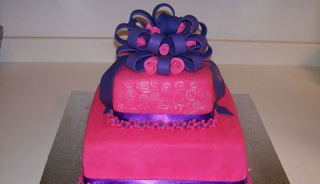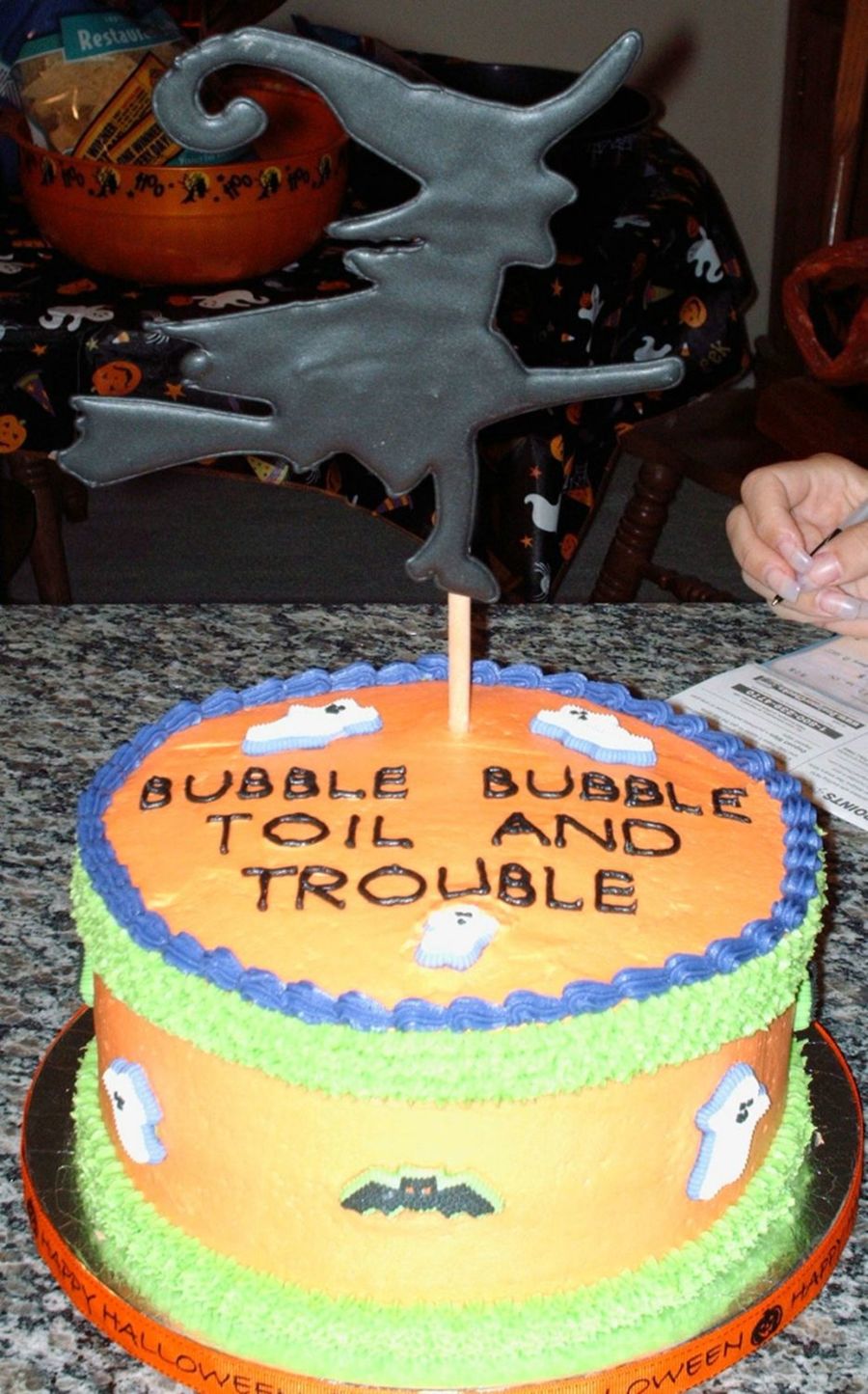 Buttercream frosted cake with Wilton icing decorations and a color flow witch on top. Always make 2 or more color flow pieces(my first broke on the way out the door.)