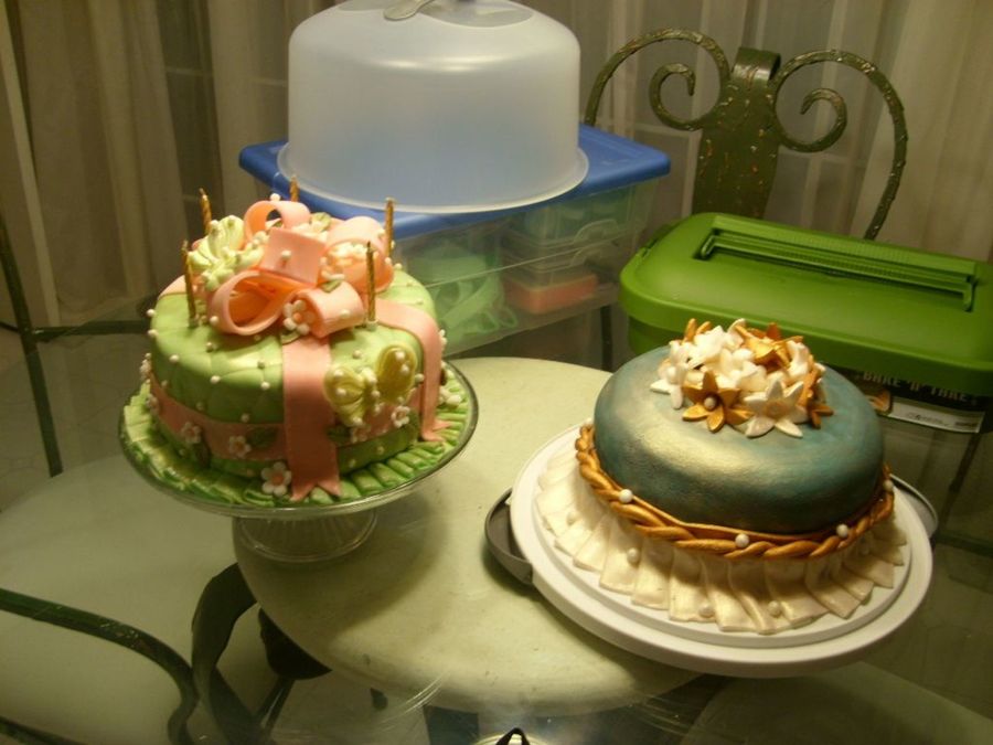 Both of these cakes were made in the same day! Both cakes were baked the previous night at 1:24 am. Mother's b-day cake was finnished around 8 am and then my friend's cake was finnished around 6 that evening for his b-day the next day. I wouldnt let my mother cut her cake until I got a pic of the two cakes together.