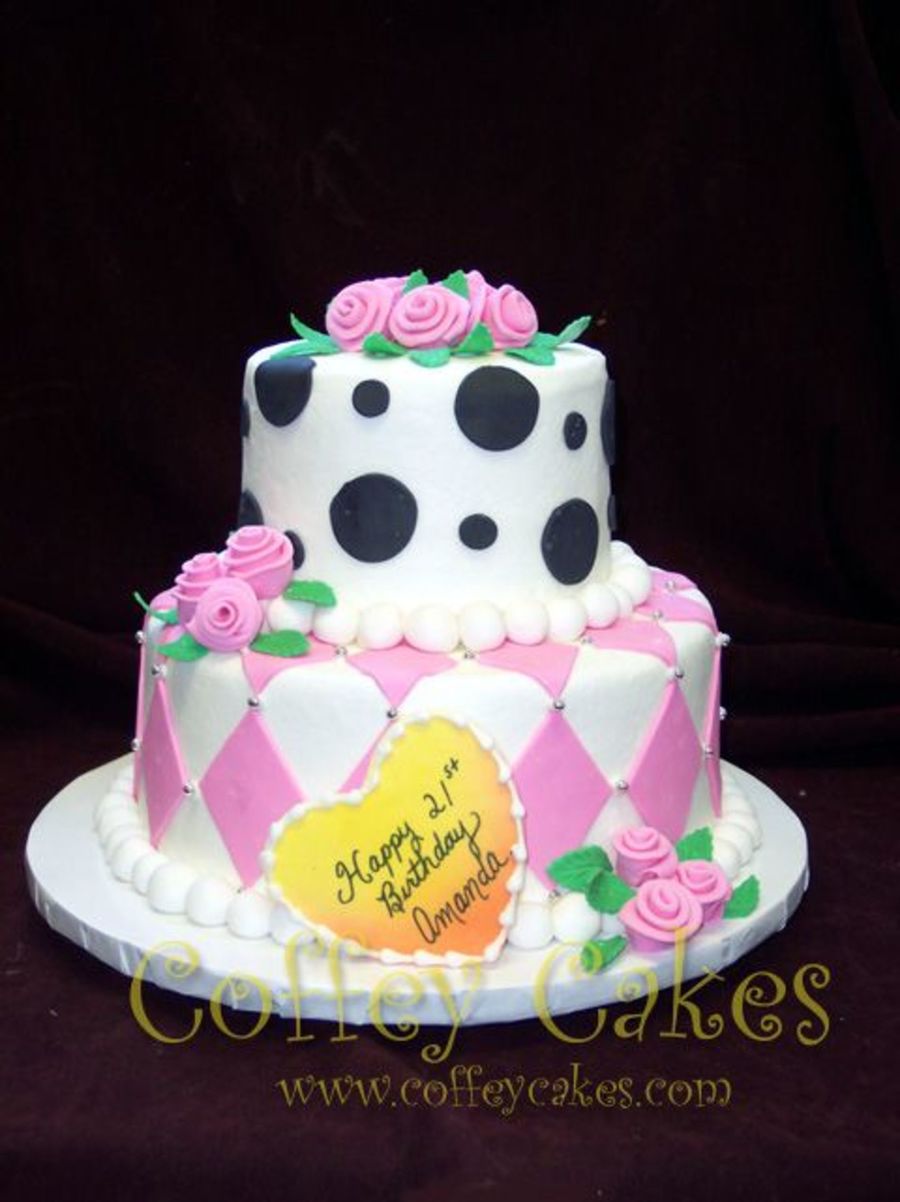 This customer just wanted whimisical type patterns but not the shape, which was fine with me! :) She had a picture from a magazine that we loosly designed this cake around but the the colors, shape and topper are different. I wish I knew who to credit but I don't even know what magazine it came from. This is a buttercream cake with fondant ribbon roses and accents. Thanks for looking.