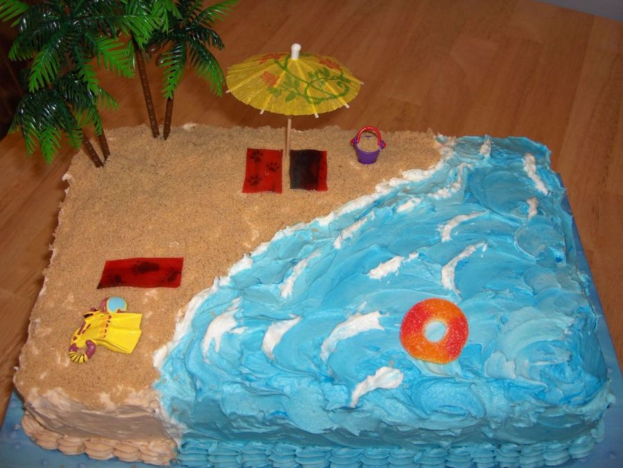 I got married last year barefoot on the beach in Jamaica. I made this cake for our 1st wedding anniversary. Trees and accessories plastic, towels are fruit roll ups, peach candy ring floating. I got the ideas from this site. Thank you!