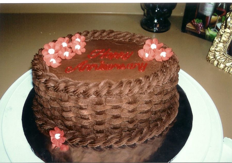 Chocolate buttercream basketweave cake with royal icing flowers.
