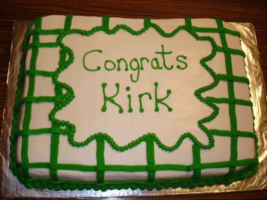 This cake was made for a college graduation party. The university school colors are green and white.