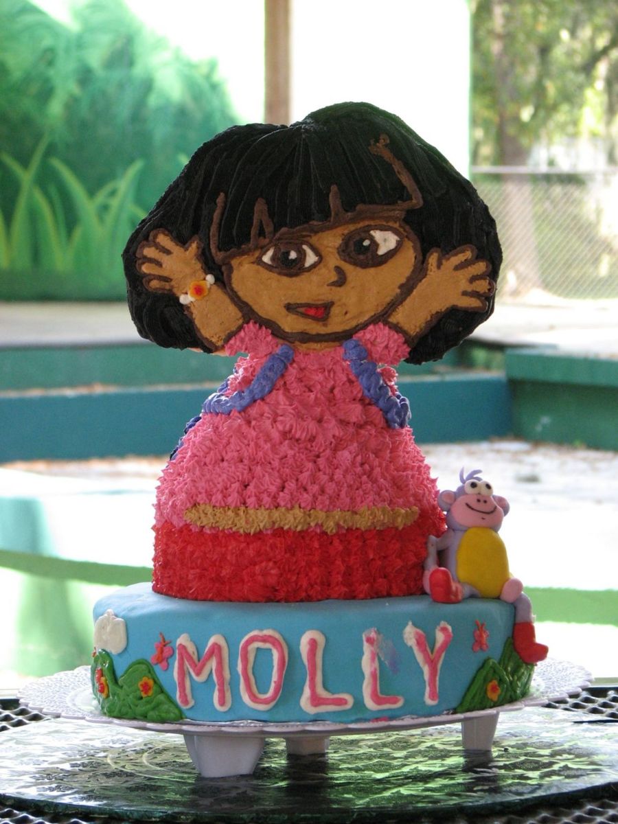This is a 2nd birthday Dora & Boots! I was not fast enough to get a picture of the cake before a little hand got to it....the smudge thru the name. The kids LOVED it....would not leave the table. Lots of fun to do....definitely makes it worth it :-) BC and fondant. Boots is fondant figure.
