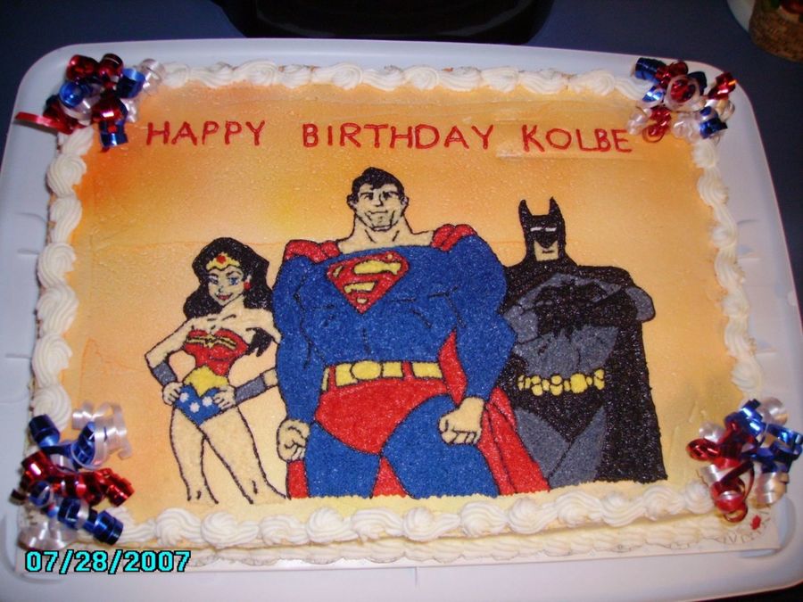 For my nephew's birthday....1/2 sheet yellow cake iced in a variation of Buttercream Dream. Started out with a piping gel transfer, but only Batman transferred completely so I had to freehand Wonder Woman and part of Superman. I know I need alot of work on my shells and reverse shells, but so far I've only gotten to take Course I and I've been trying to teach myself as I wait for a weekend class. But my nephew seemed happy with it!