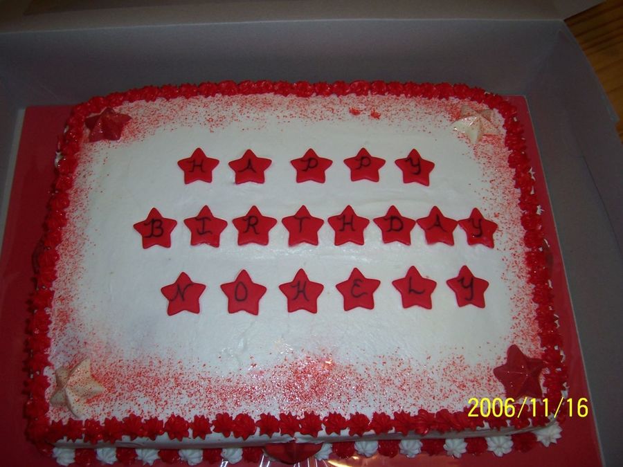 Vanilla cake with raspberry bc filling iced in bc fondant stars and candy stars.