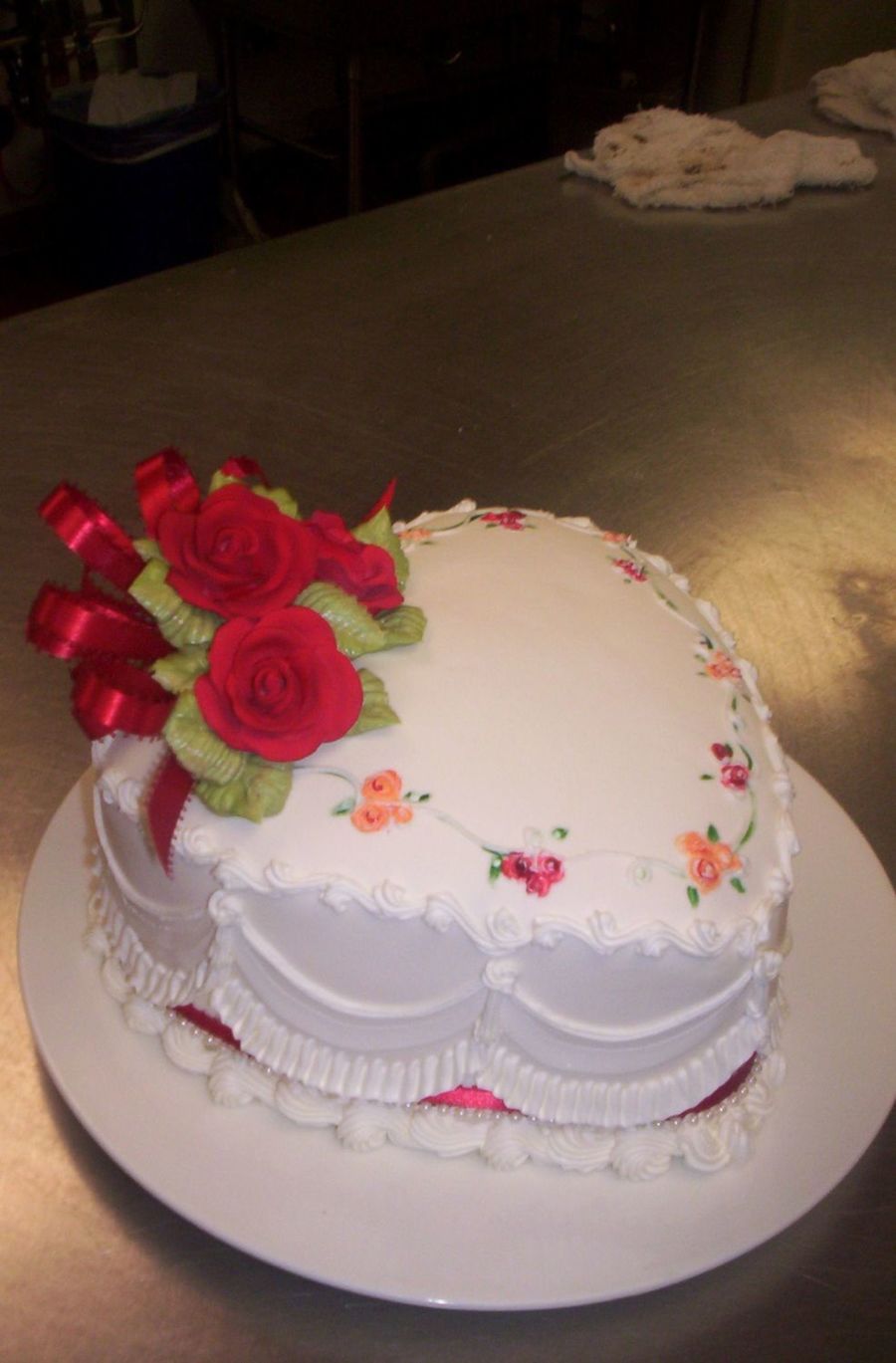 That ruffle border is something else!!! How ever did you do it without gouging the fondant with the tip or are you going to tell me it's fondant or gumpaste too!! :P What did you use to make that swag underneath the star tip swag, the one right above the ruffle? I'm very curious.