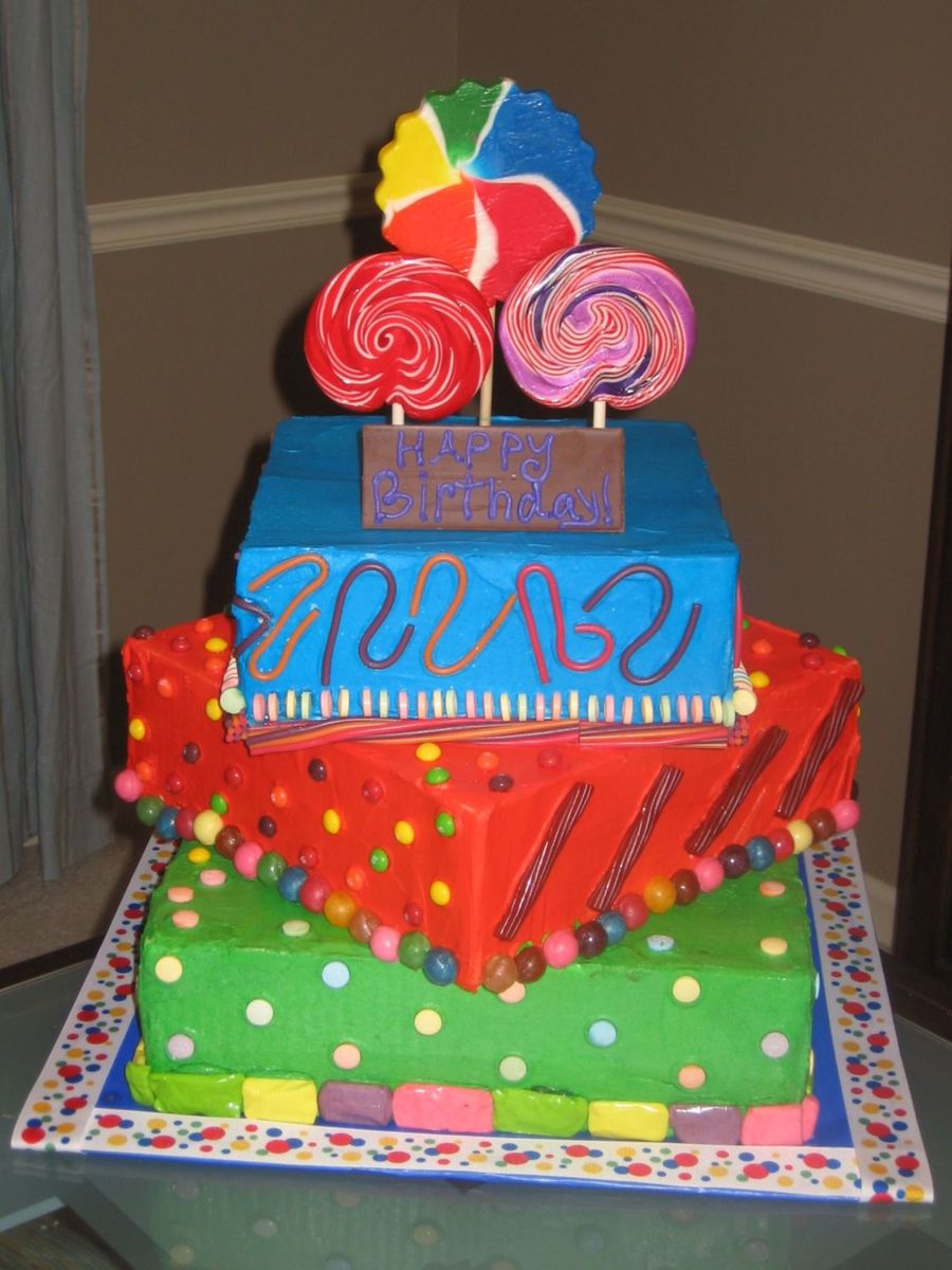 I made one of these two weeks ago and have had two requests since then. This is a big one - 14, 12, and 10 inch squares, all buttercream icing and various candy decorations.