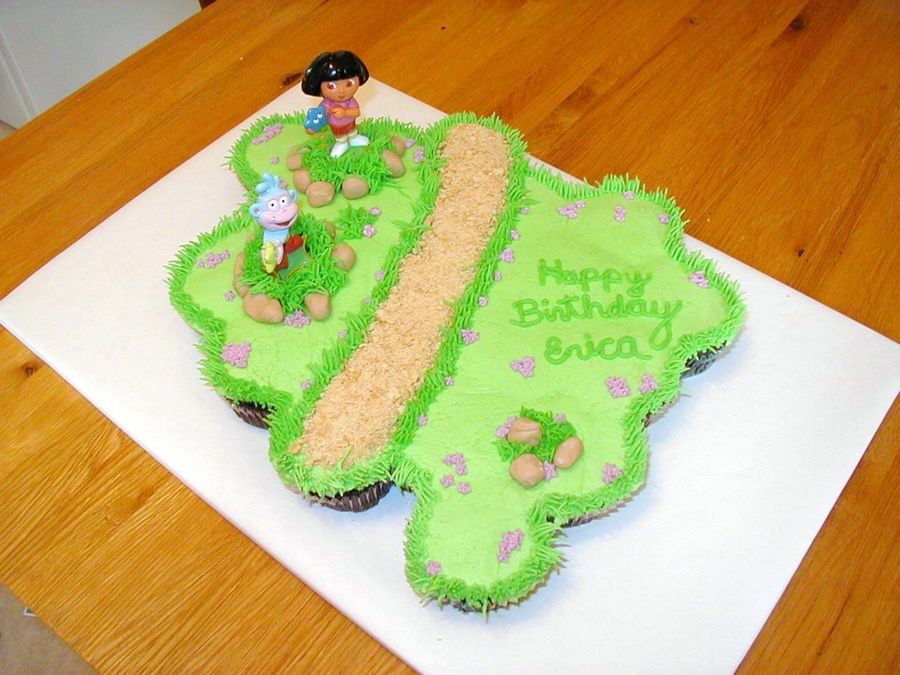 Decorated with buttercream. Fondant rocks and graham cracker crumb road.