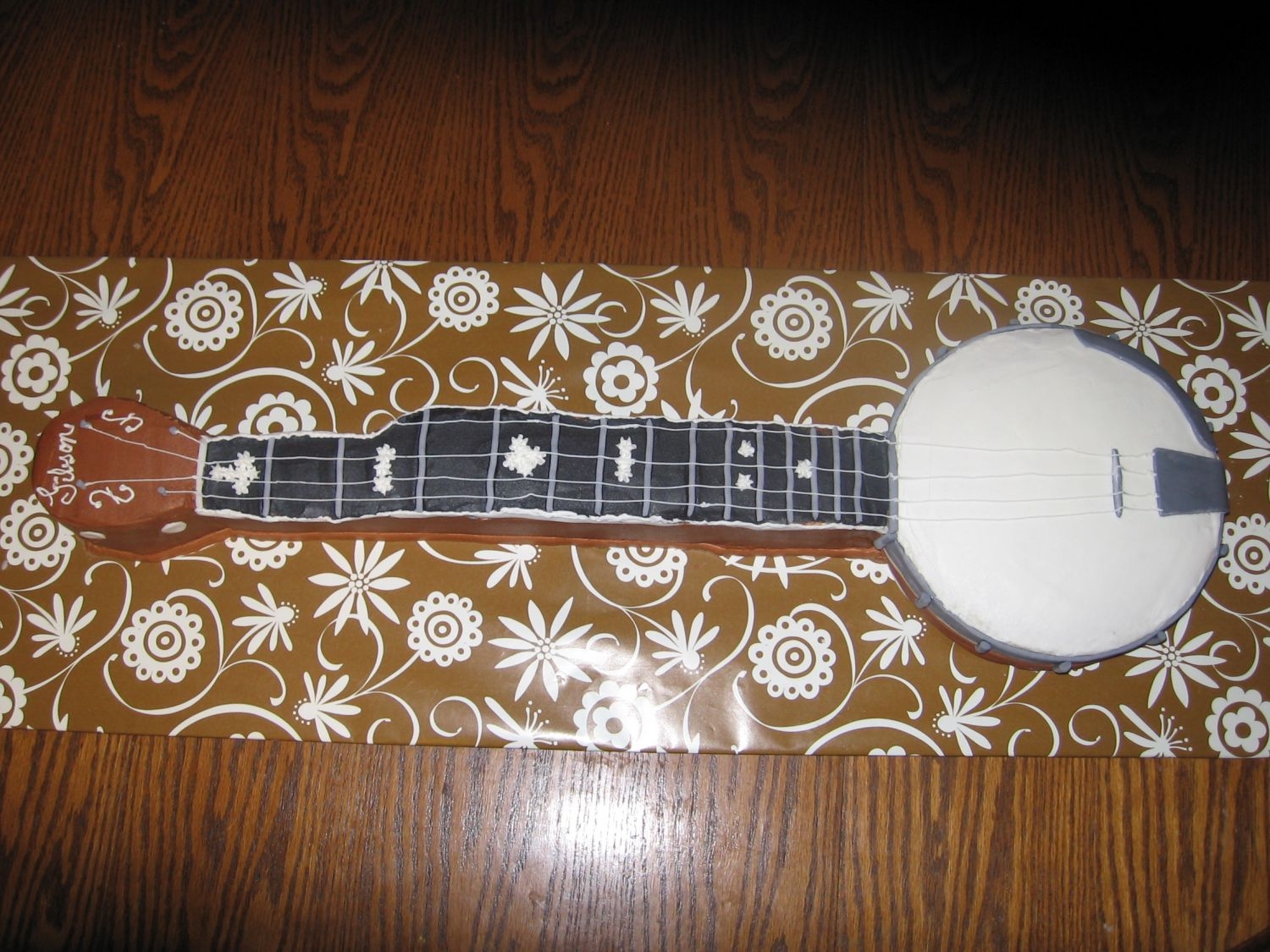 This is a cake for a banjo lover's birthday! It's a 9 inch round and the neck and head were carved from a sheet cake. Fondant and buttercream decorations. So much fun to make!
