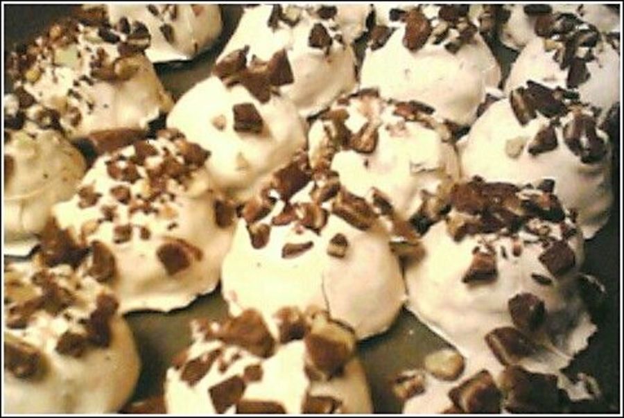1st time making cake truffles. kahlua chocolate cake w/ peppermint cream cheese buttercream and chocolate chips, dipped in white chocolate, topped w/ mint andes. my family absolutely loved them!!!