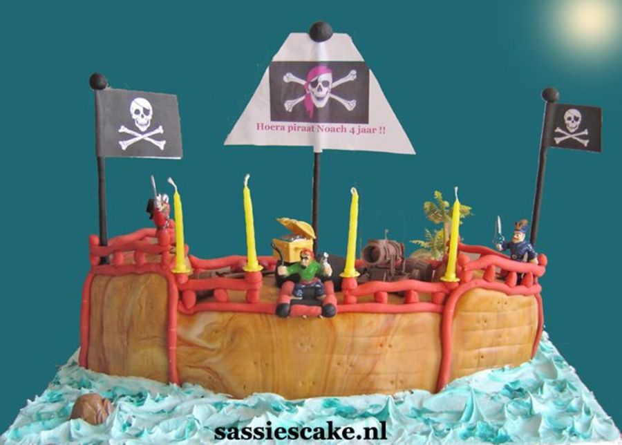 The ship is cake covered with sugarpaste, the pirates are plastic figurines.