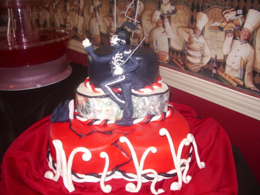 3-tiered (top 2 red velvet, bottom devils food) all covered in MMF. Broken heart design on bottom red tier with black fondant rose and thorny vine joining the crack in the heart... with handmade gumpaste marching "black Parade" figure. Middle tier white with edible images of the band all around. Top tier black heart.