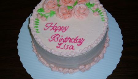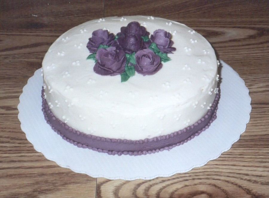 Single 9" layer in buttercream, for my mom and sister. 1st attempt at a frosting ribbon and beads. Still in my 1st year and my technique needs work, but it's my favorite cake so far