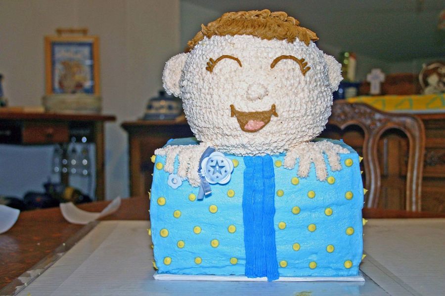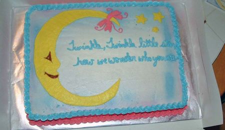 I made this cake today for my friend's baby shower. Well, the cake came out cute, but when we went to deliver it, it fell apart into lots of pieces. I was so mad! I am fortuante that I had taken pictures prior to taking it to the shower. I wanted to cry, but I had to laugh so I would not. I kept the other part of the cake that was suppose to be underneath, and used it. What a learning experience!