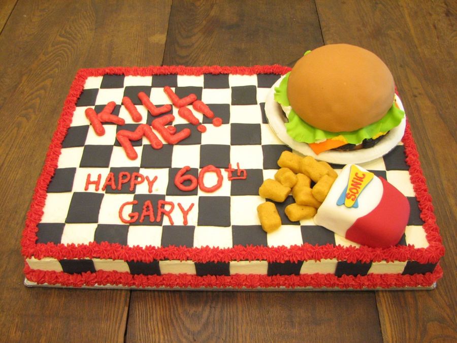 This cake was for a customer whose husband was turning 60. Its a big joke at their house that every time she gets take-out for dinner, he yells Kill me! (cuz this kind of food is bad for him). Anyway, choc and yellow cake with buttercream icing and fondant accents. The hamburger was yellow cake with fondant. Time consuming, but really fun cake to make!