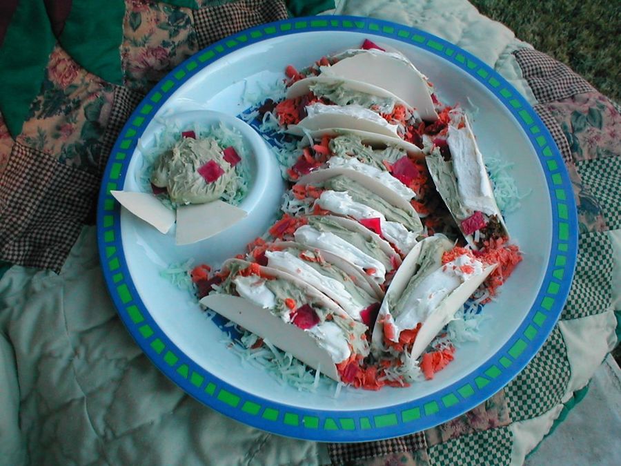 Almond bark shells, coconut lettuce, grated candy melt cheese, gummy tomatoes, buttercream, oh yes, and the meat is chocolate cake.