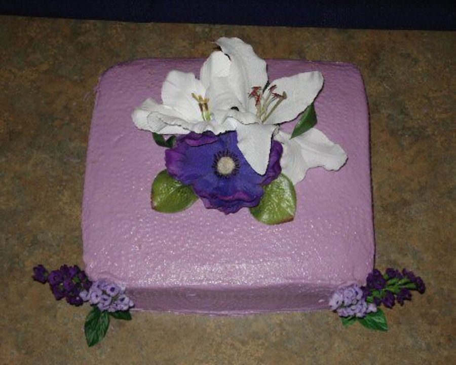 This was a practice cake that I did to try out using paper towel to make an impression. Silk flowers on top and iced in buttercream.