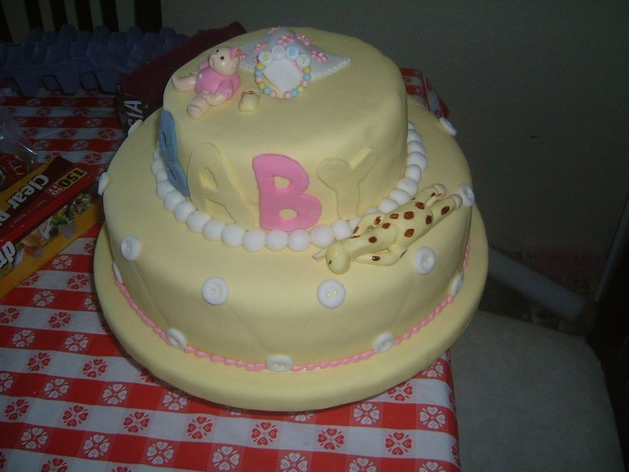 A baby shower cake in fondat with a little girl and a girafe