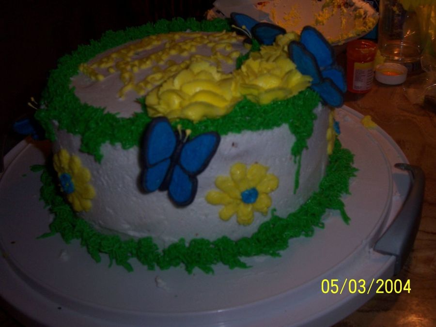 Made for my garden loving neighbor for her birthday. Handmade royal icing butterflies, and BC "moss" and roses.