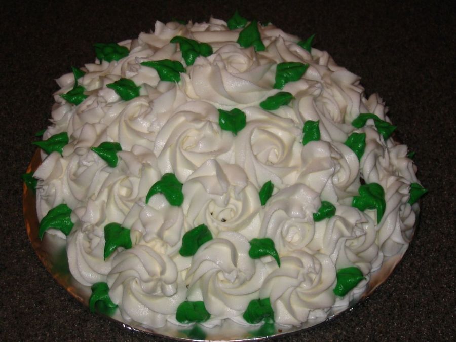 What a cute cake!! Put it on top of an 8 inch basketweave cake and you have a basket of flowers. (Check my pix.) Great look, the white with dark green leaves. Nice job! :D