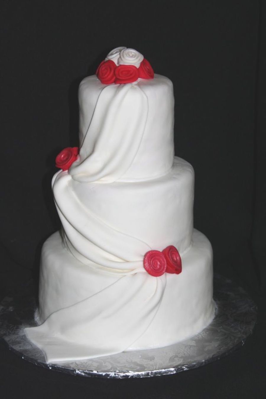 Small (4-6-8) engagement cake for my bil and his fiance'. I have wanted to play with drapes for so long and never had a chance till now! I finally figured out what I'm doing wrong with my fondant-I'm rolling it too thin and it shows everything-but I figured it out after I was done :(-next time better!