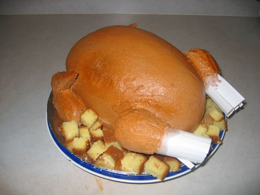 This is my 1st turkey cake. I'm happy with the results but there are some things that could have been better. 1 leg kept giving me such a problem and kept breaking. I had to use a dowel to attach the legs. I was happy at the end though.