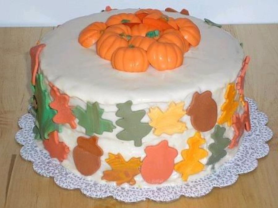 White cake w/ buttercream frosting. Satin Ice leaves and acorns, choc. pumpkins on top of cake. (oops, buttercream was a bit "runny.")