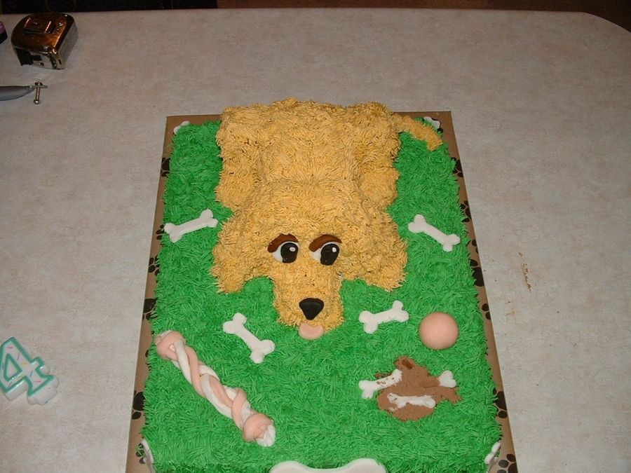 My daughter decided on a puppy theme and of course wanted a puppy cake. My first time making a 3D cake. Thanks to all who offered up advice. There is a bone that you can only see part of where I wrote Happy Birthday.