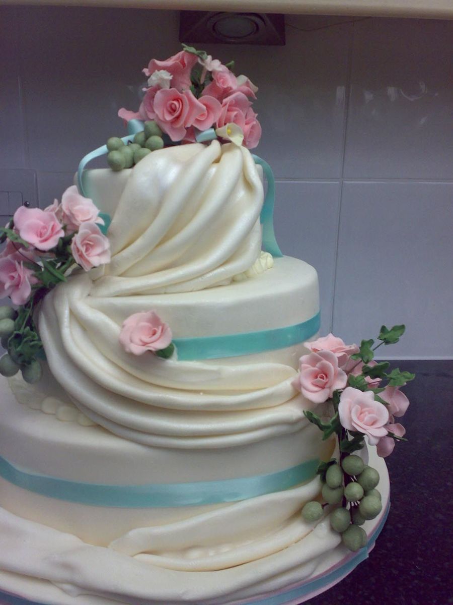 Ivory 3 tier wedding cake, with roses and grapes decoration and turquiose blue ribbons. This is my 1st wedding cake and i got all the top tips on how to go about the drapes from this wonderful website, i would not have been able to do it without you. thanks a million!