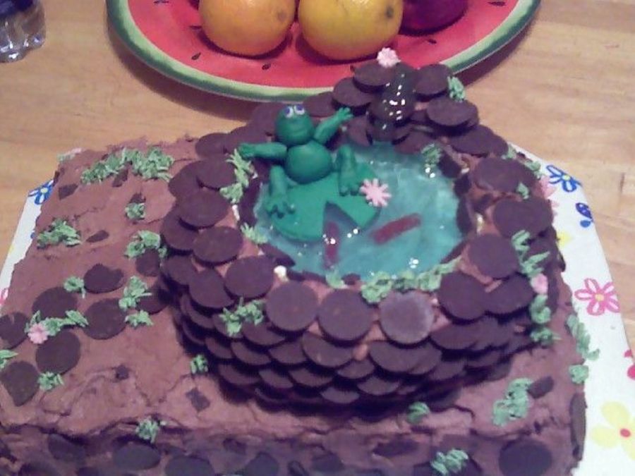 White cake with chocolate buttercream frosting. I used candy melts for pond & made frog from fondant. Made for a friend at work. I was inspired by a similar cake on here, but I can't remember whose cake it was. I do know that they made it look a lot easier to make the pond than it was. Lol.