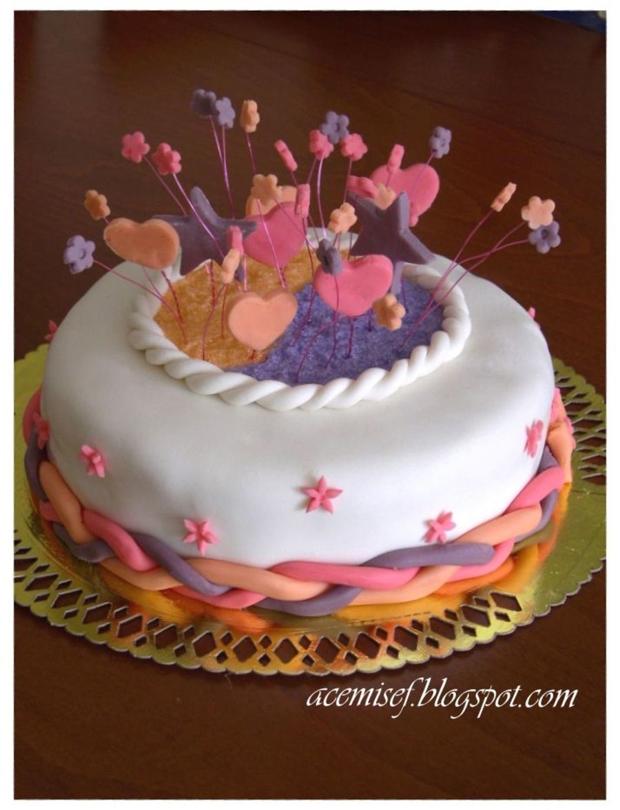 I made this cake for my a very close friend. It has white cream and cranbarries. Figures are made by sugarpaste again from 1 day ago. I used for top, colored powdered sugar.