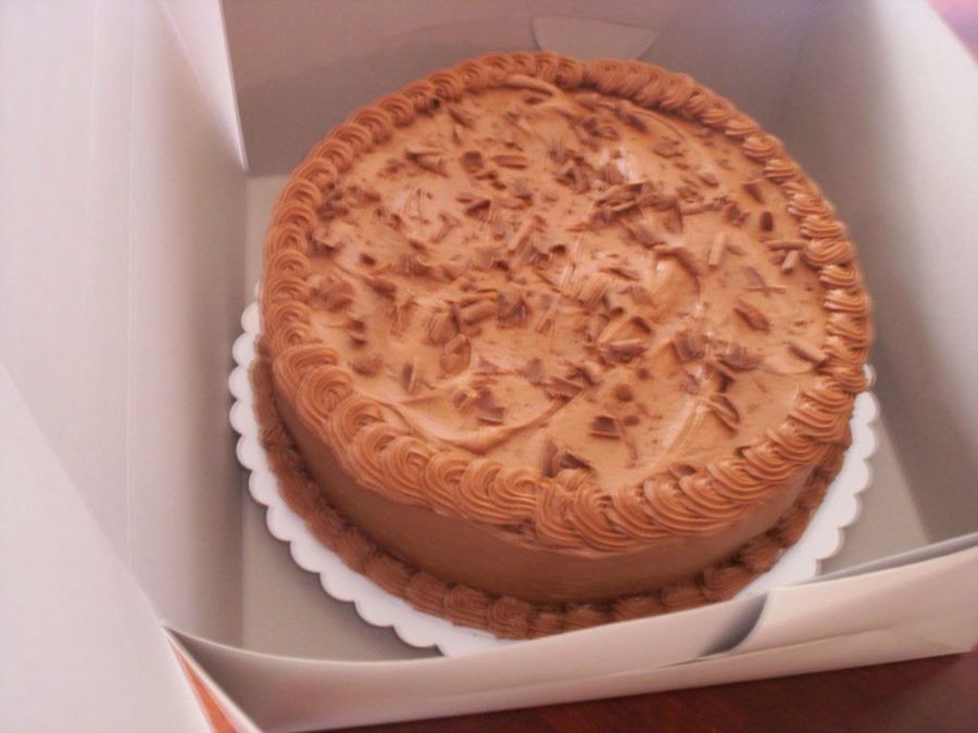 I made this for my parents for Thanksgiving, sad to say I had to work and couldn't try it :( Double layer 10' white with bavarian cream filling, iced with chocolate buttercream, and Hershey chocolate shavings on top