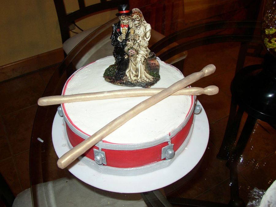 Drum cake I did for a grooms cake. He's a drummer in a band. It has fondant sides, and fondant drum sticks