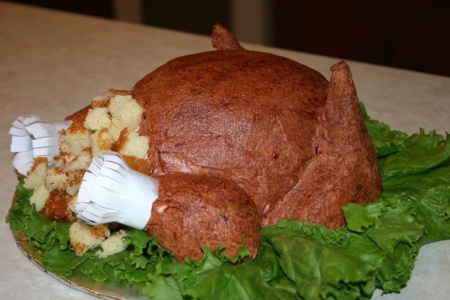 The wing is a sugar cone and a clump of icing the drumstick is cake
