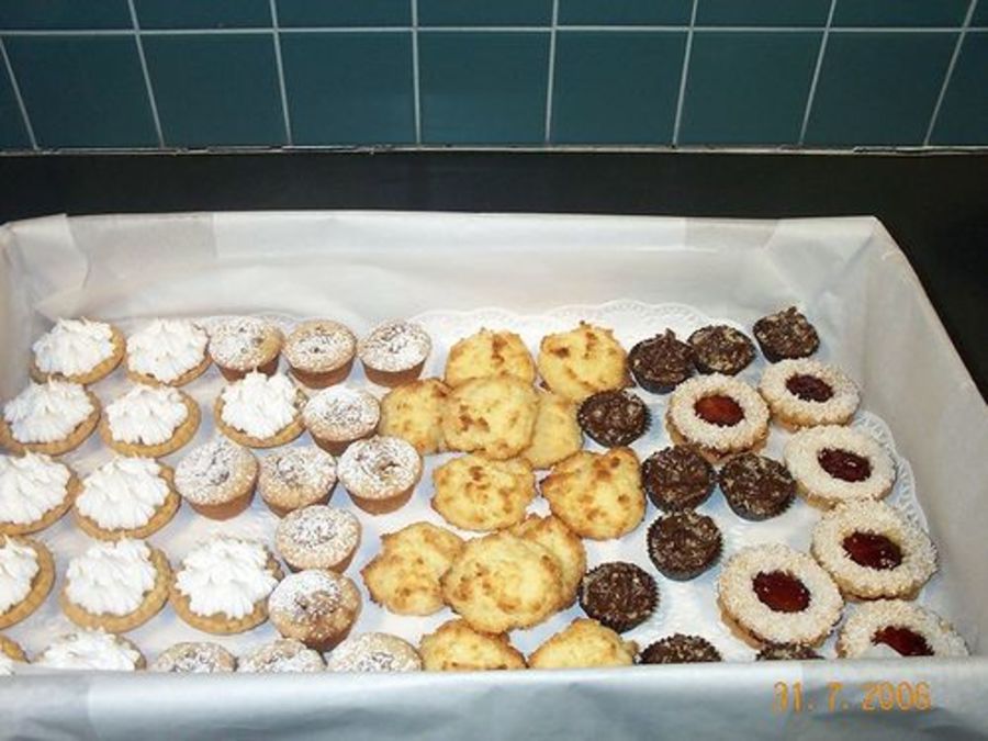 mini lemon meringue tarts, pecan pies, coconut macaroons,hazelnut/choc cups & jam biscuits