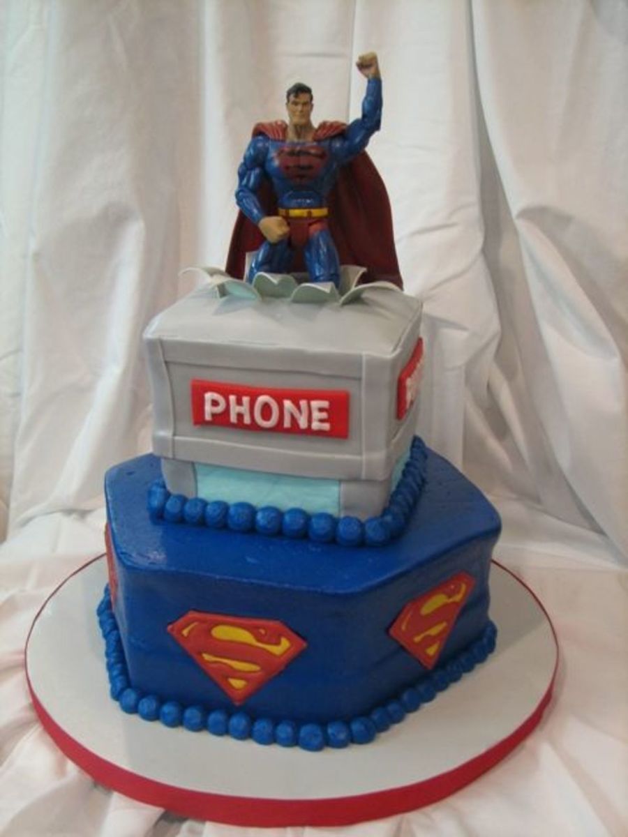 This is a cake I did for a friend's son. He picked the superman figure out and wanted him to be tearing through the cake. We decided to have Superman breaking through the phone booth.