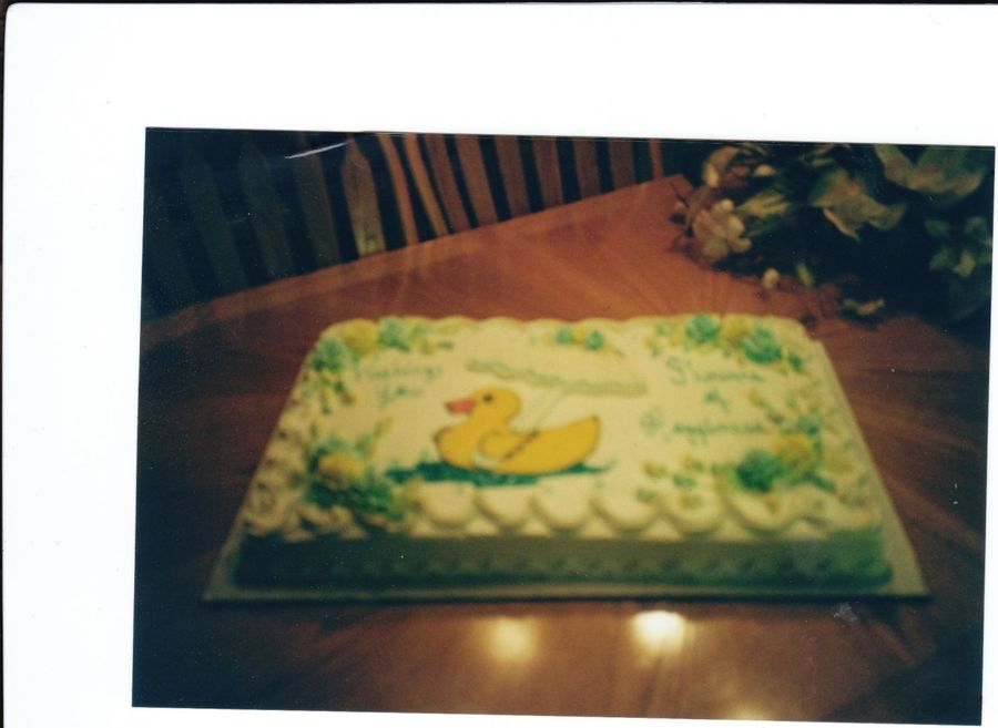 Customer had a rubber duck theme and wanted it incorporated into a baby shower cake. Duck holding umbrella and sitting in a pond.