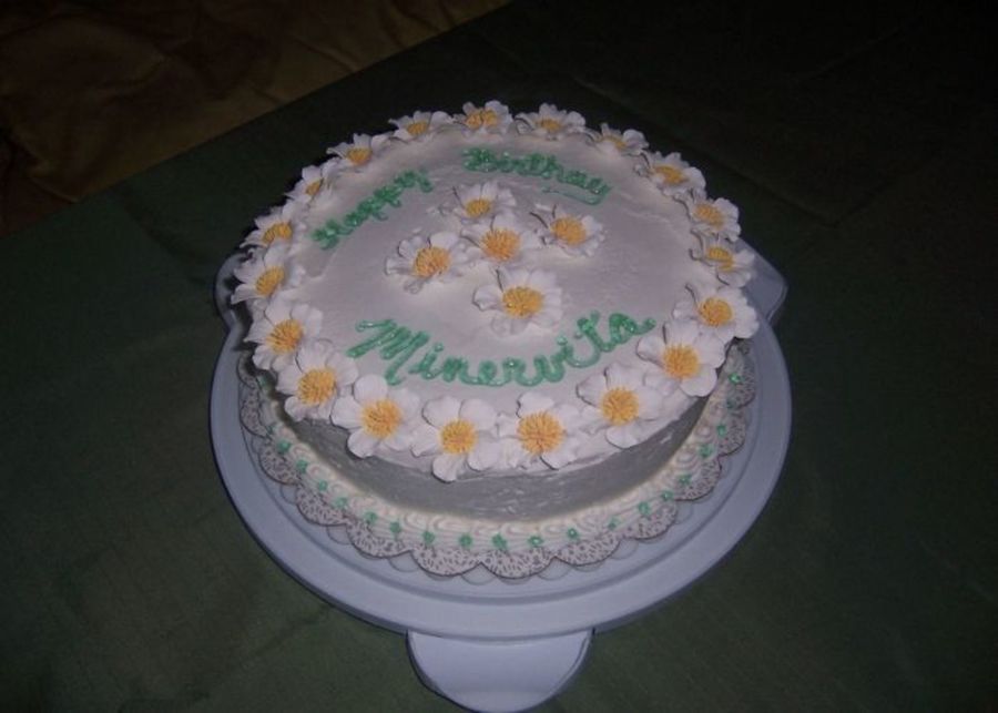 A 10 inch round cake covered with butter cream and gumpaste flowers for decorations.