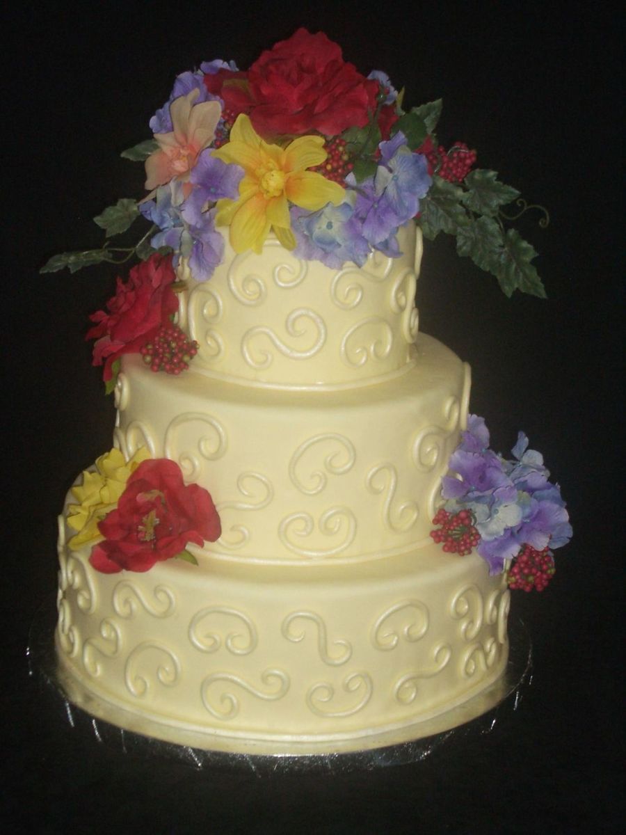 This is a display cake. Covered in yellow fondant, with fondant scrolls. Each scroll was painted with super pearl to add dimension. The flowers are silk.