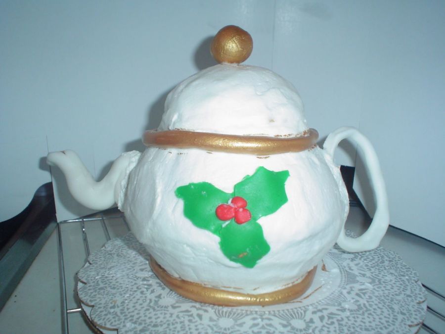 This is the tea pot I made for my Aunt Gail. The cake is vanilia pound cake. Butter cream icing. Fondant accents painted with old gold luster dust. My husband had to do the fondant stuff for me. Thank you to Quadcrew & anythingsugar. If I have forgotten to thank someone please forgive me. My Aunt cried when she saw it. I know there a tons of things wrong with it. Feel free to give advice.