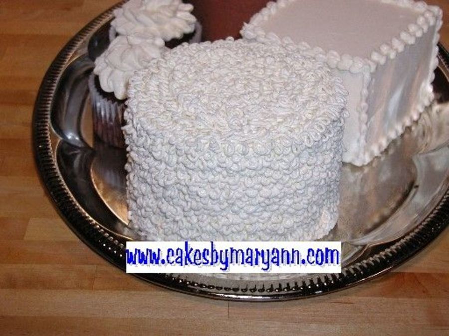 I iced the cake as I do normally. I used a #3 tip or a #2 tip. Start at the bottom and start making a circullar motion. Turn the table as you go so it looks like loops. As you come back to the point you started overlap and continue all the way up the cake. It has a lace yarn look to it. The picture lost a bit in resizing. It looks lke hundreds of srtrings! save the pic and enlarge it to see better detail!