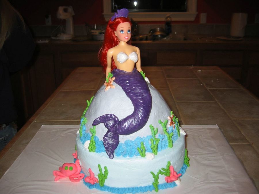 I used the Wilton teen doll pick but took the head off and put an aerial head on. I had to use a glue gun to make sure it wouldn't fall off. Its buttercream with fondant accents.