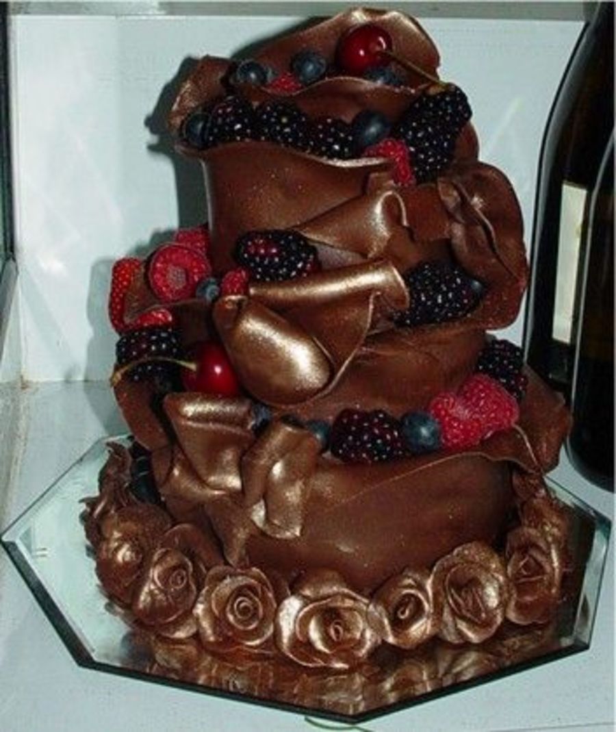 This is a cake I saw in a book. It is a very dence chocoalte cake 3 tier. 3" 4" 5" cake. Stacked with no supports. The outside of the cake is molding chocolate. Molding chocolate roses were also added at the base. Fresh fruit tops off this chocolate cake. It was devine!