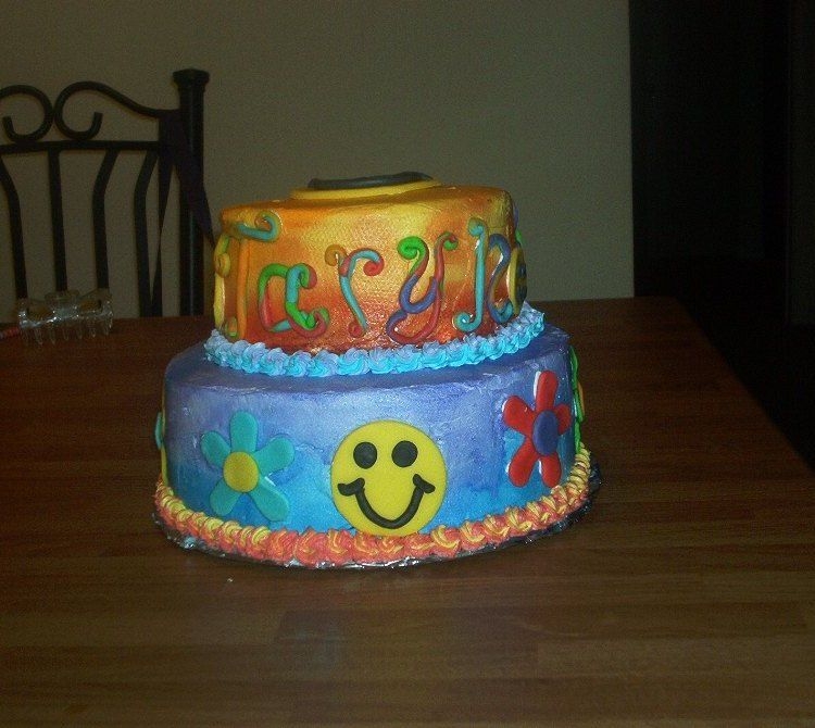 my daughter wanted a tie dye cake for her BDay... so this is what she got. the first time i ever stacked a cake .IT turned out so good. We were very proud of this one. The moms at the party liked it too.
