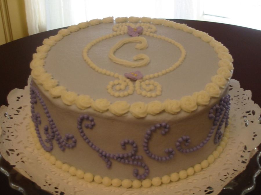 A monogram cake for a going-away party for a co-worker. Used scroll press along the sides. Royal icing violets on top. Tip 2 beads.