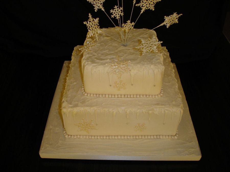 Winter wedding. The bride wanted a mudcake on the bottom and a fruit cake on the top. Wanted snowflakes and iciles in keeping with a winter theme.